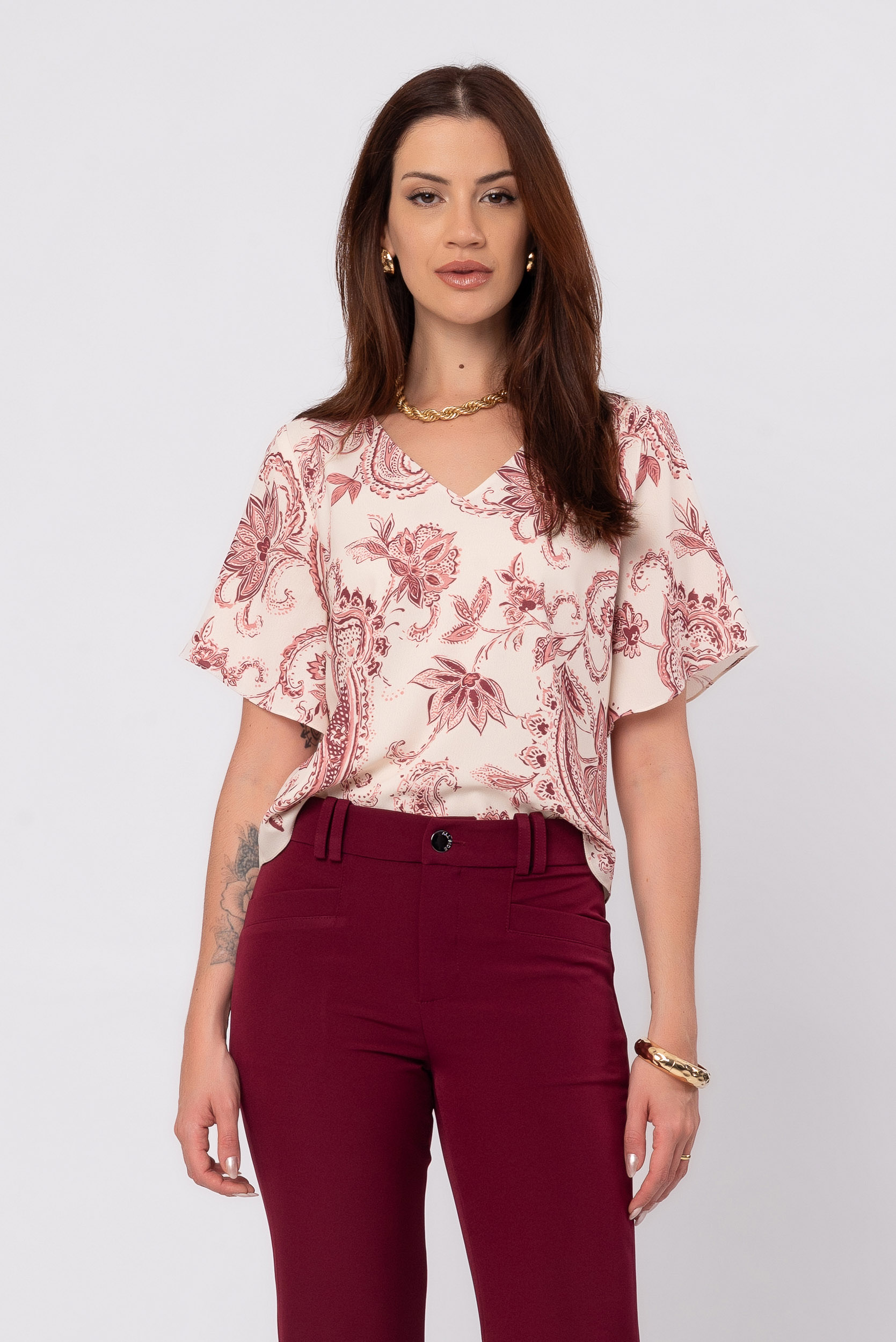 A modelagem de manga curta garante versatilidade, permitindo combinações com calças de alfaiataria, jeans, saias ou shorts, criando looks que vão do trabalho ao passeio com muito estilo.