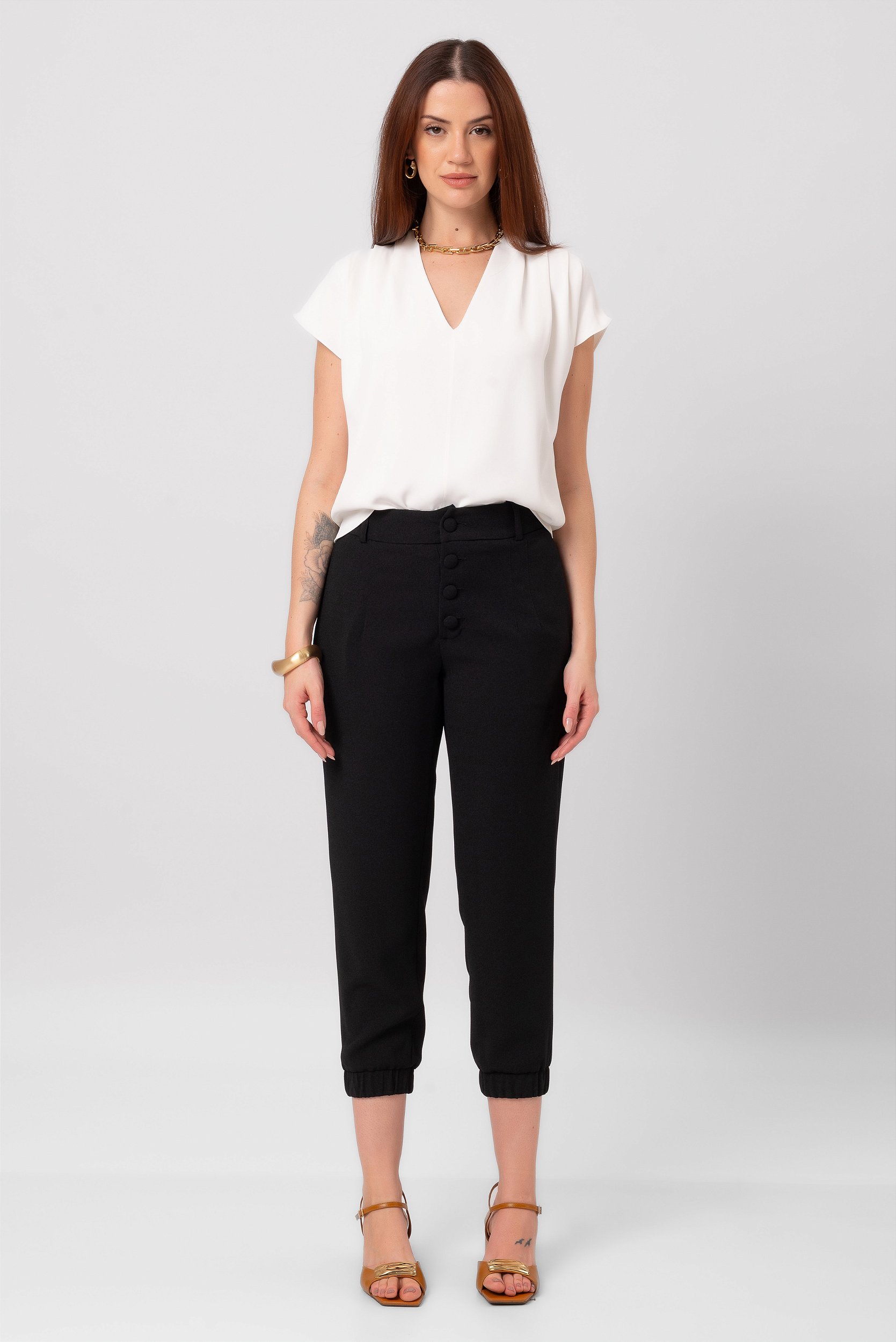 A Calça Carol possui modelagem de calça cropped, possui botões forrados e elastico na barra. Se você quiser criar um look casual ou de passeio, essa peça é perfeita para você.