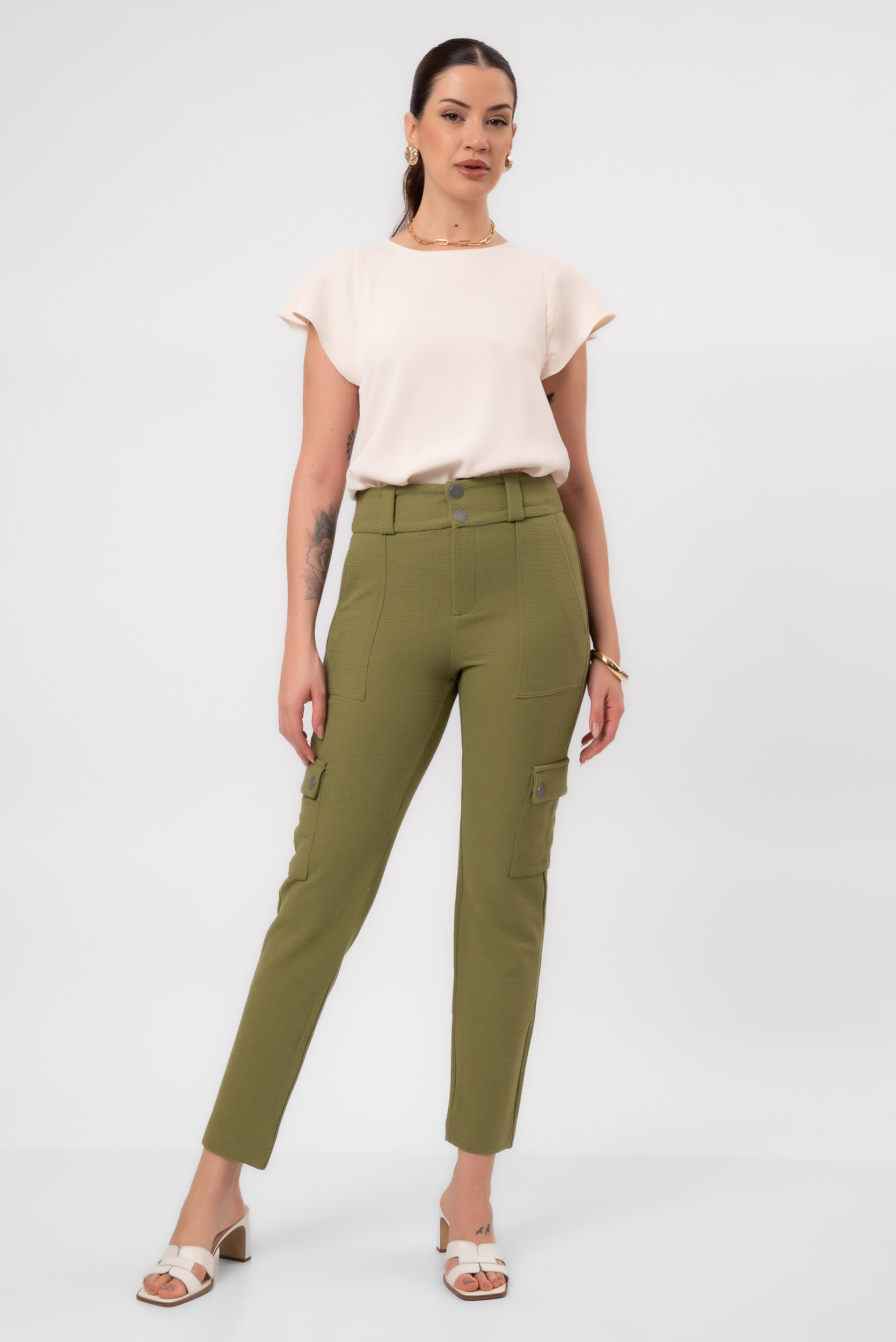 CALÇA RETA TWEED BOLSOS NAS LATERAIS OLIVA MILENA