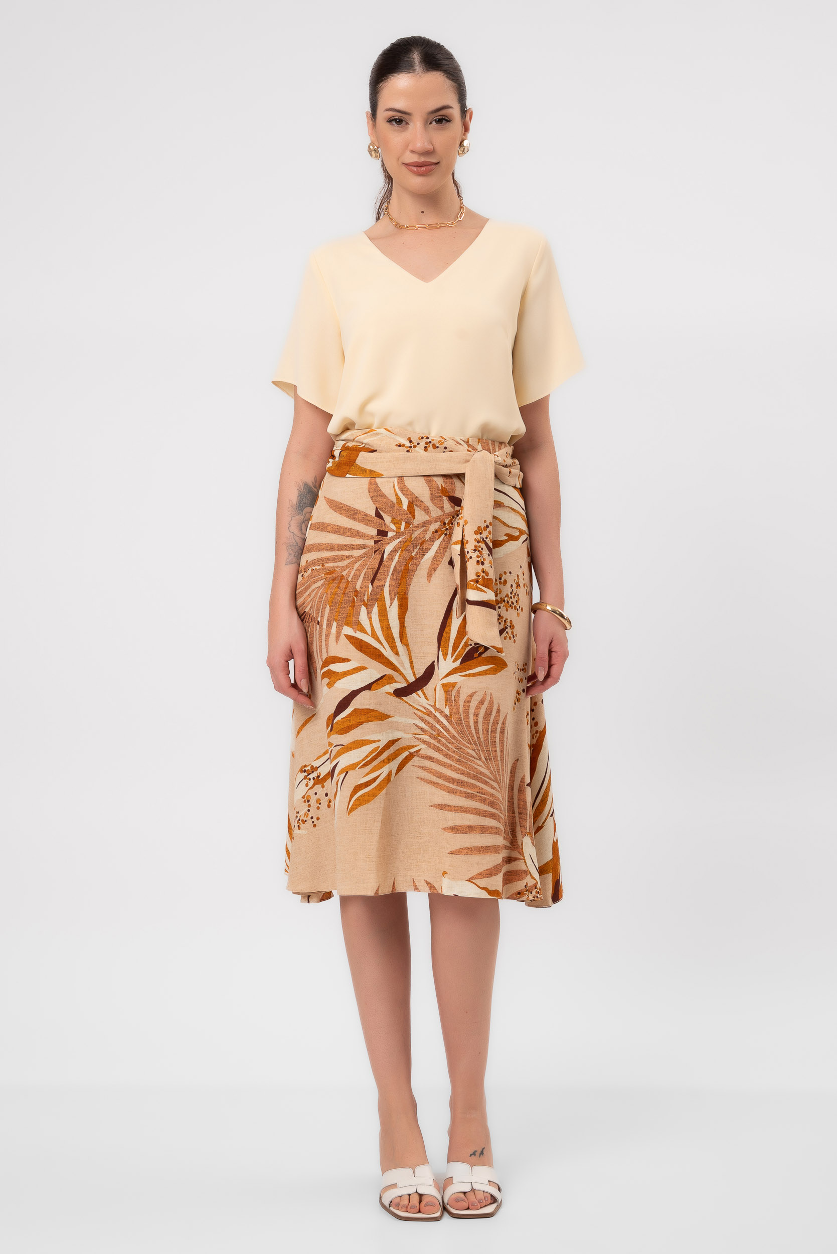 A Saia Midi Outono é confeccionada em crepe, com a modelagem midi e básica. A peça possui amarração frontal e comprimento midi.