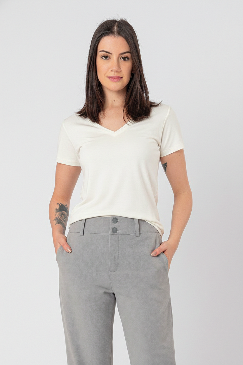 T-shirt com decote V e corte acinturado, pensada para realçar a forma feminina com leveza. Confortável e charmosa, é ideal para quem busca praticidade sem abrir mão do estilo.